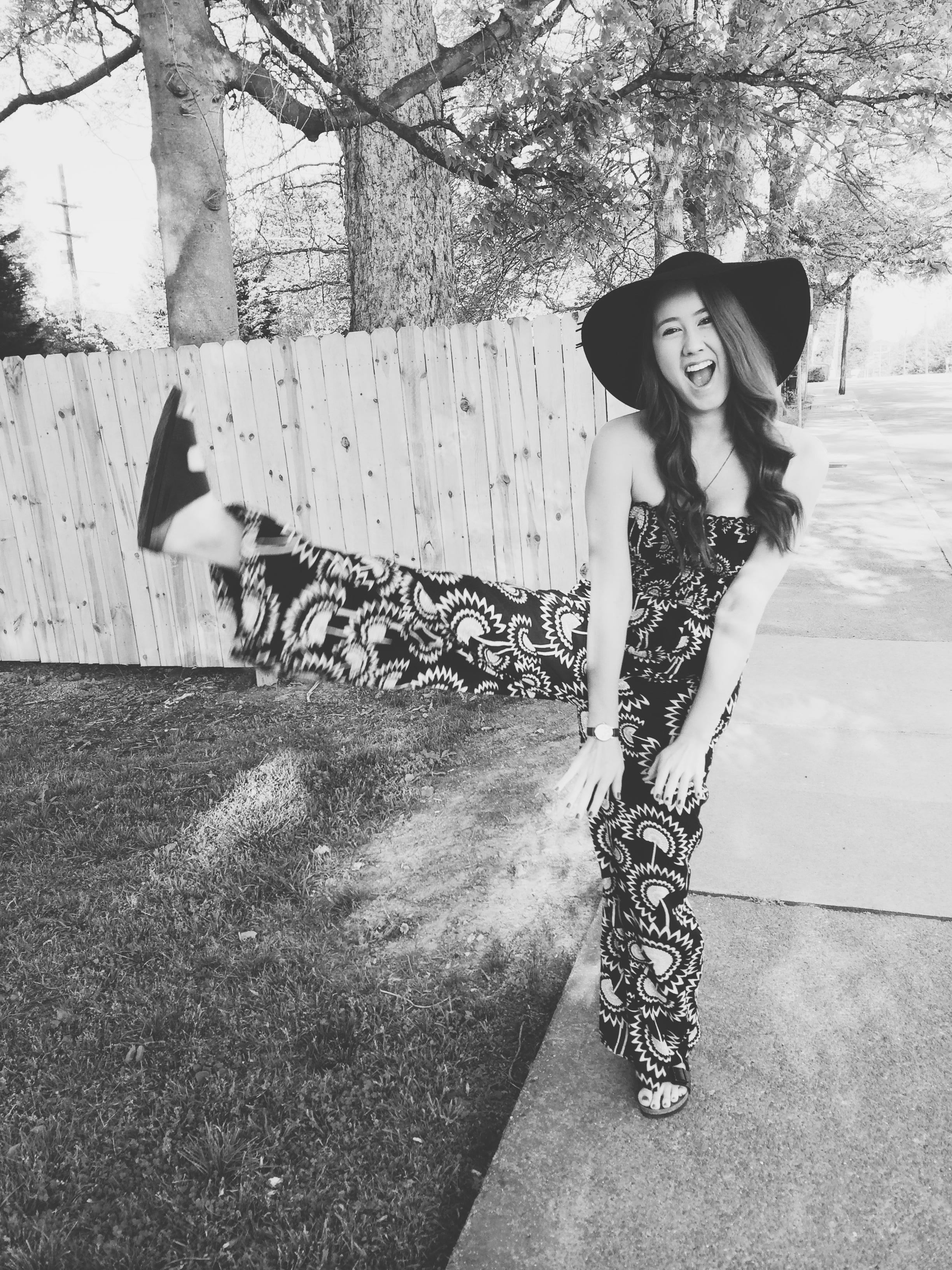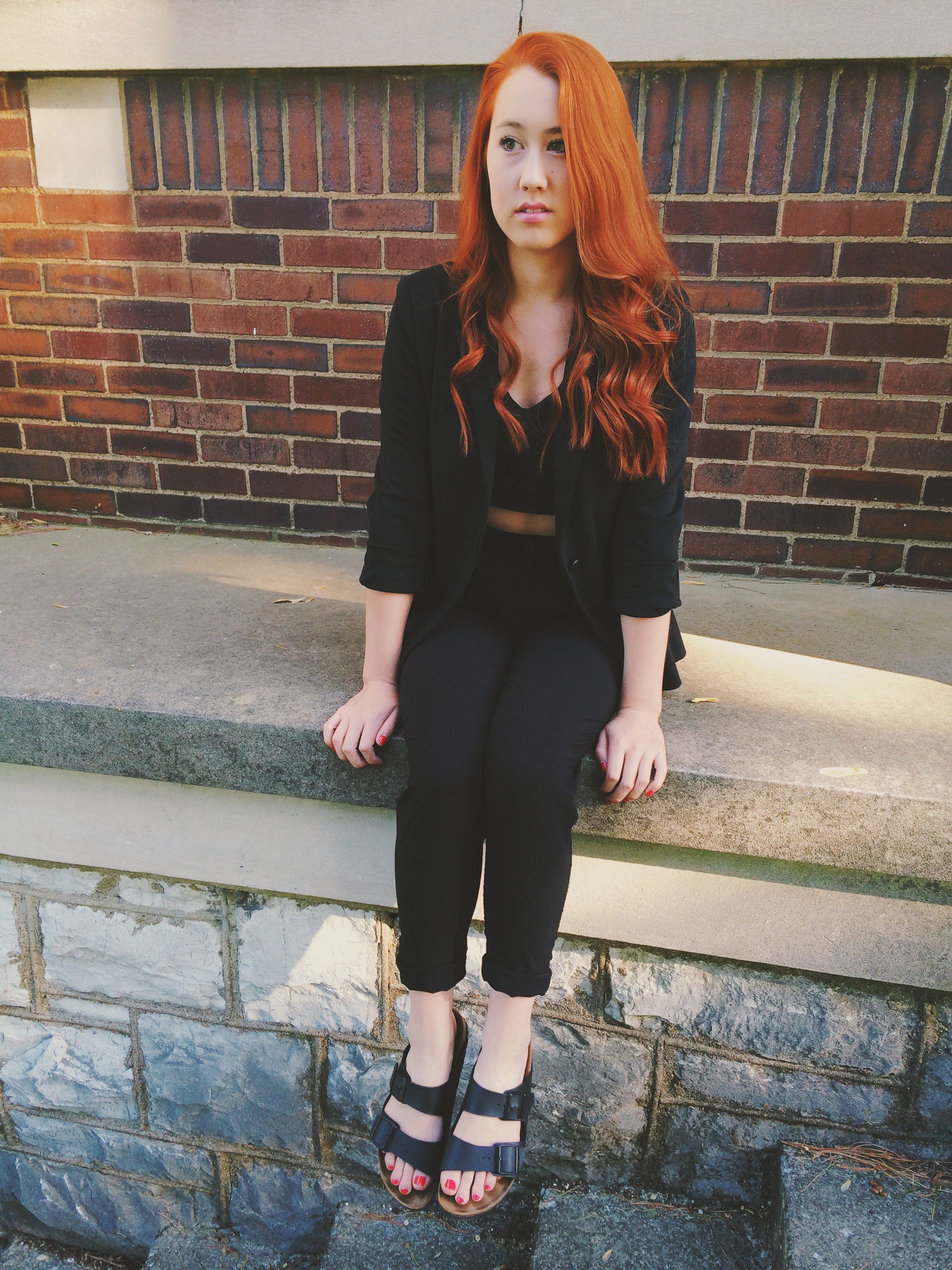 Black matches with the majority of my wardrobe and was the "most-pinned" for immediate outfit inspiration. I styled the Birks two ways: sporty and boho. I was drawn to all the creative pantsuit looks on the Internet and decided to take a stab at my own version. I'll let you in on a secret: the crop top I'm wearing under the blazer is actually a T-shirt—I just rolled it up and under. The pants didn't initially cover my belly button, so I borrowed a pair of Chloe's suspenders to position them.
