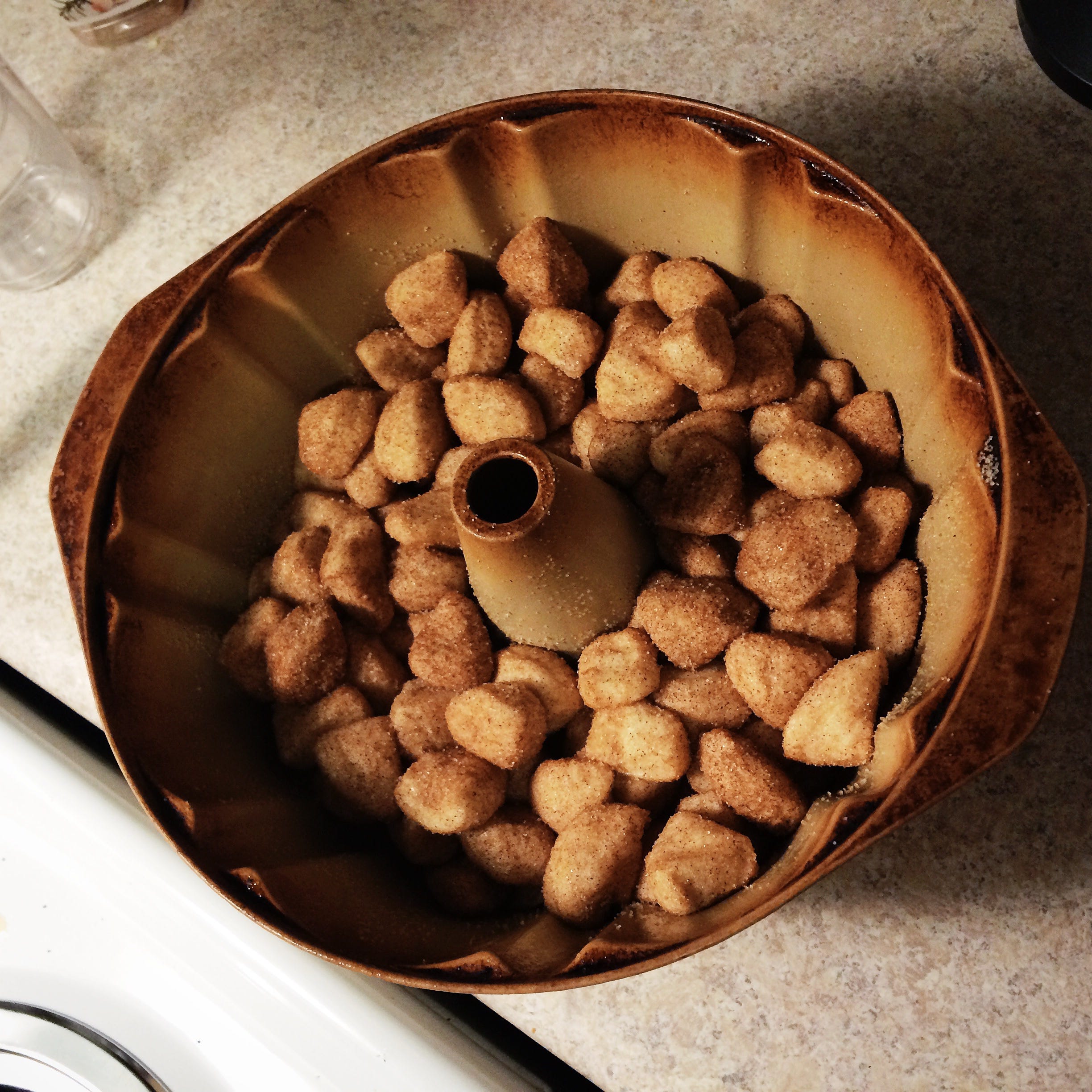 5. Pour sauce evenly over biscuits in the bundt pan. Bake at 350 degrees for 50 minutes. *Tip: Lay piece of aluminum foil on top to prevent the exposed pieces from getting hard and crunchy.
