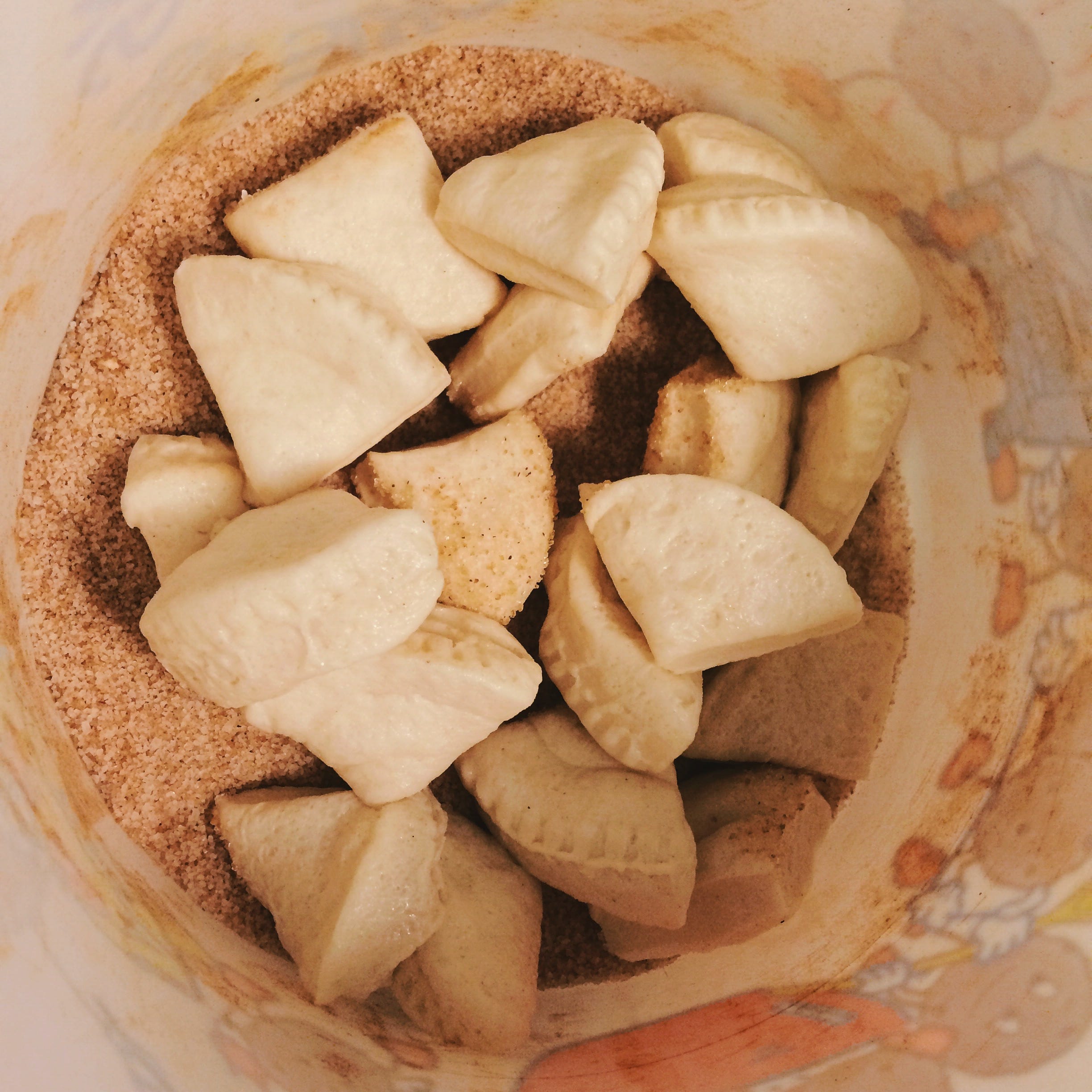 3. Create dry sugar and cinnamon mixture in bowl with lid to toss biscuits in. Close lid and shake biscuits until they're covered. *Tip: Do this one roll of biscuits at a time and after each roll add a little more cinnamon.
